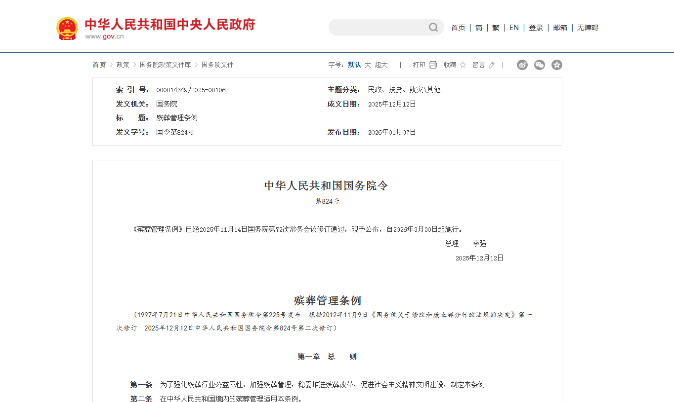 国务院总理李强日前签署国务院令,公布修订后的《殡葬管理条例》(以下简称《条例》)。《条例》自2026年3月30日起施行,全文共8章73条,修订的主要内容如下。